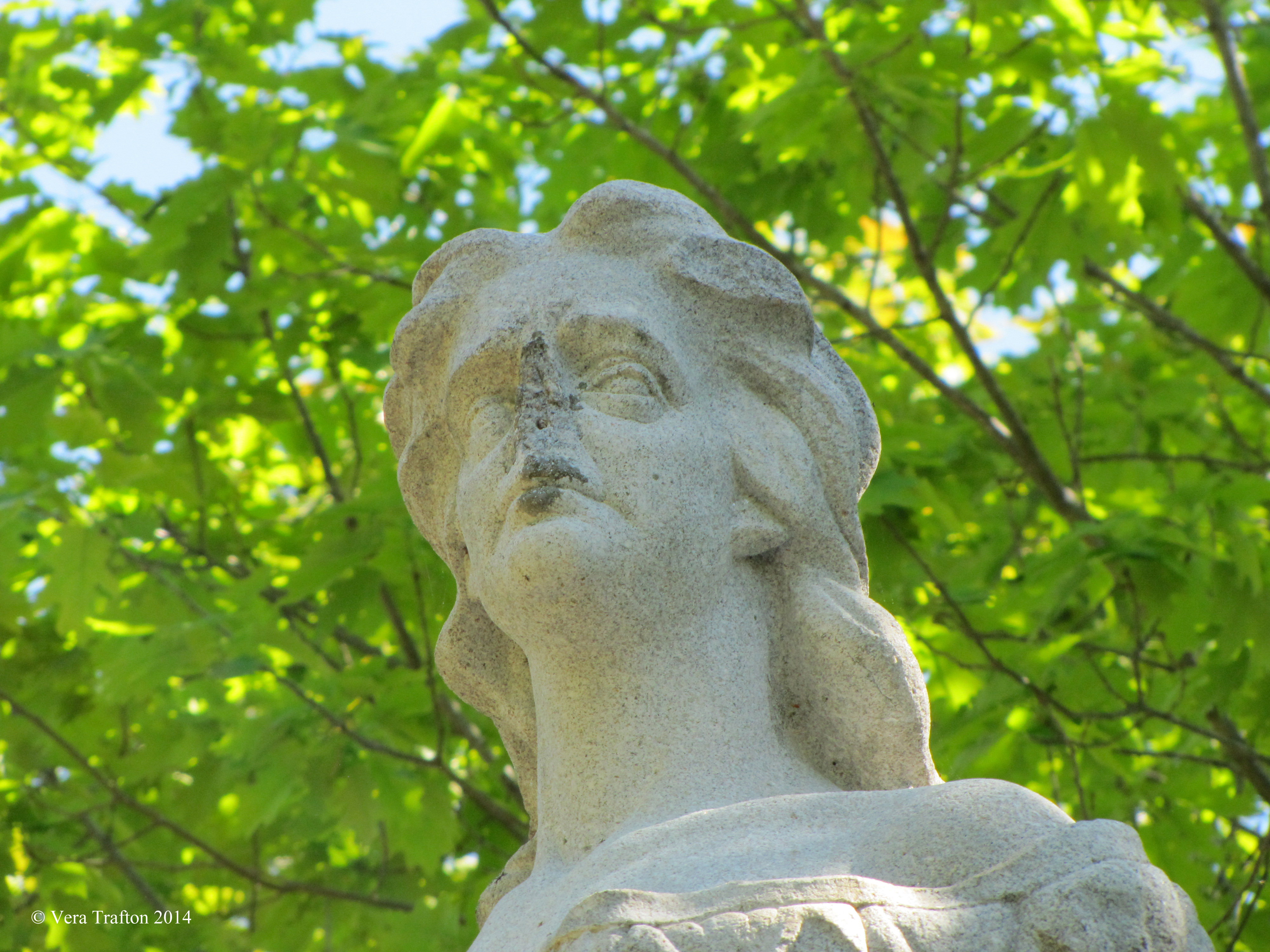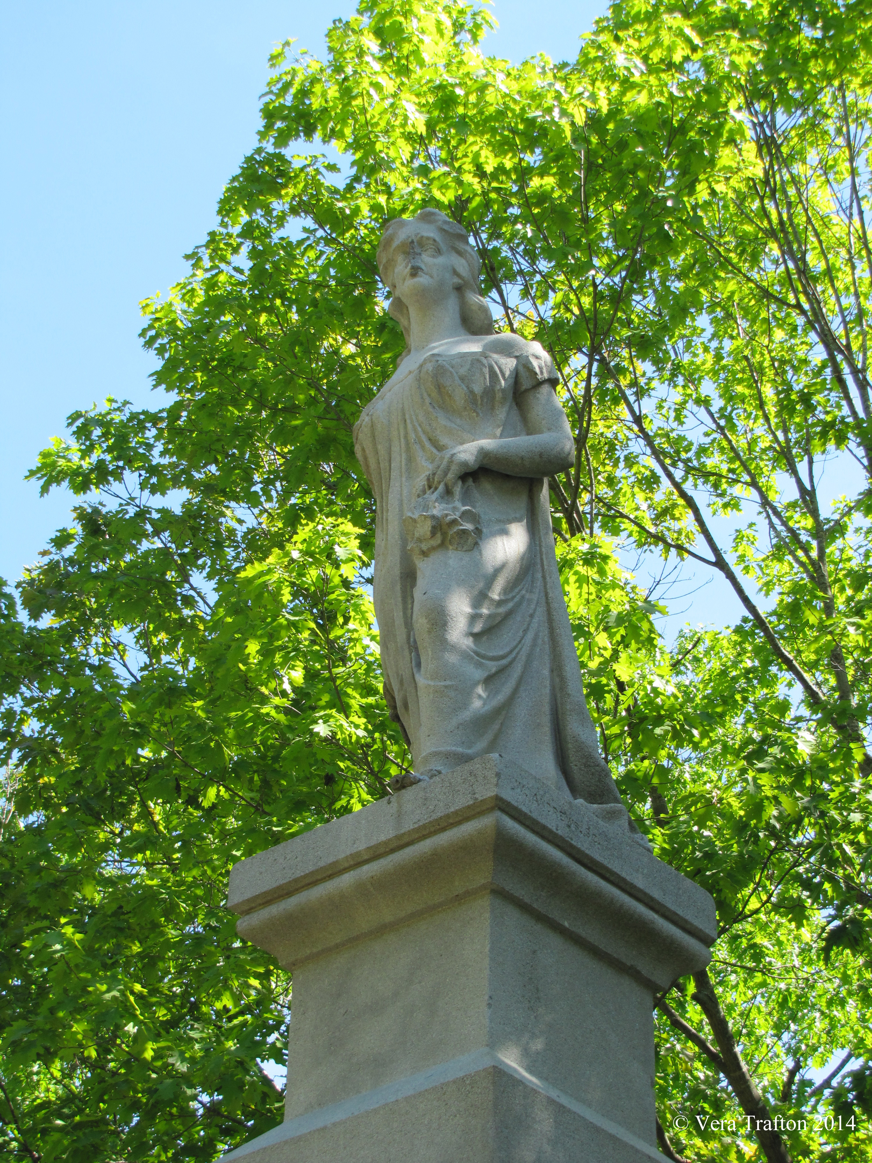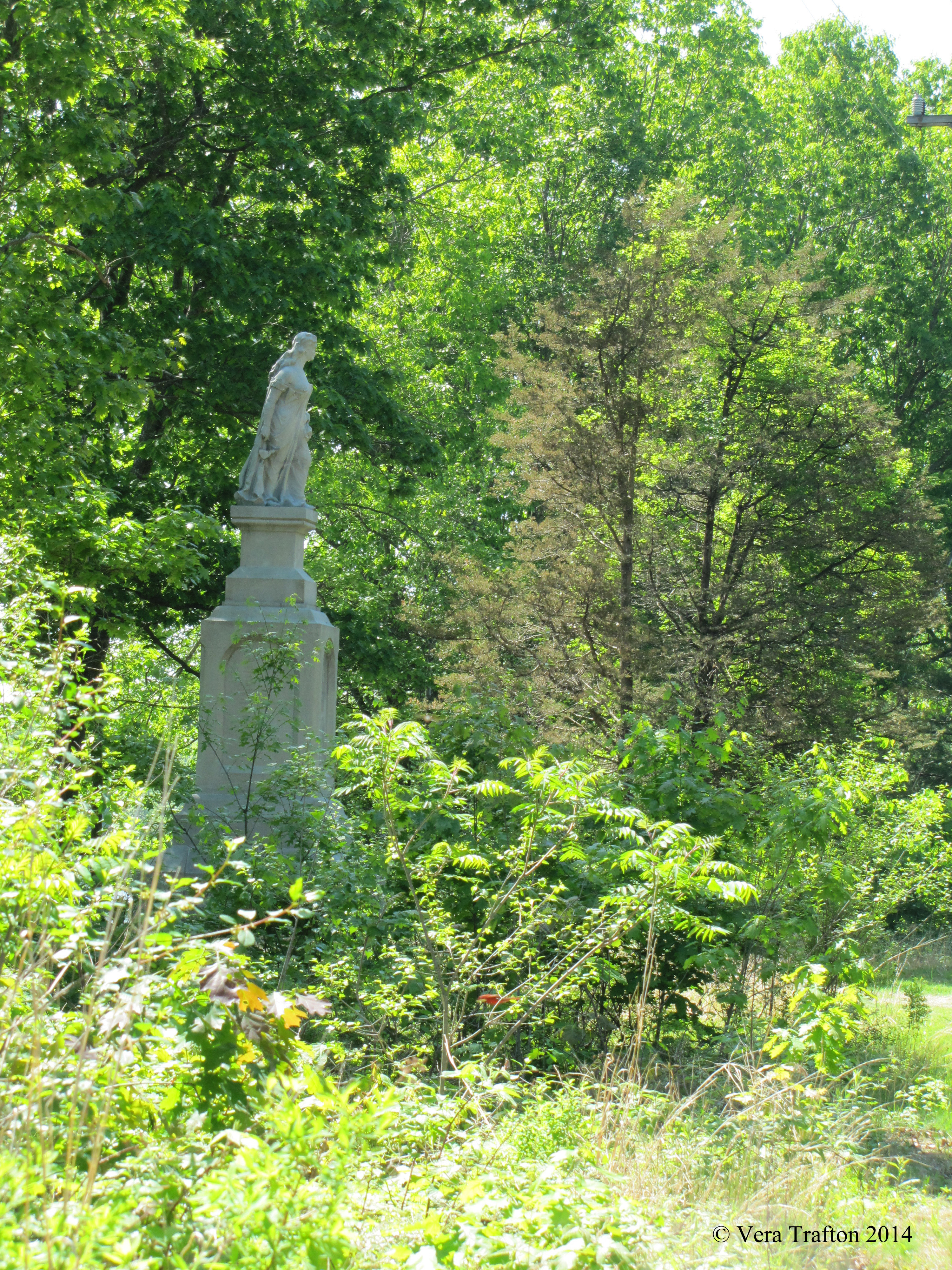 a permanent solution to the monument’s vulnerability has yet to be found. For example, the island remains accessible to the public only by private boat or by venturing on foot over one or the other of two abandoned railroad bridges, a means of approach which may understandably discourage some lovers of public sculpture while at the same time failing to deter those who love it only to deface it. Hannah has lost her nose to marksmen at least twice and has also suffered other indignities. Those ugly stains on her face are the remains of earlier efforts to repair her nose. However, it is not those blemishes that trouble her eyes and give her face that haunted look.